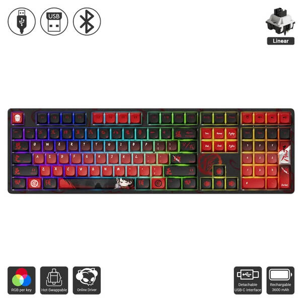 The Akko 5108B Plus "The Degenerate" is a full-size mechanical keyboard that combines striking anime-inspired aesthetics with high-performance features. It offers tri-mode connectivity, RGB backlighting, and hot-swappable switches, making it ideal for both gaming and productivity.