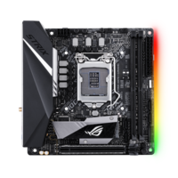 Intel H370 mini-ITX gaming motherboard with Aura Sync RGB LED lighting, Intel 802.11ac Wi-Fi, pre-mounted I/O shield, dual M.2, SATA 6Gbps, USB 3.1 and HDMI.