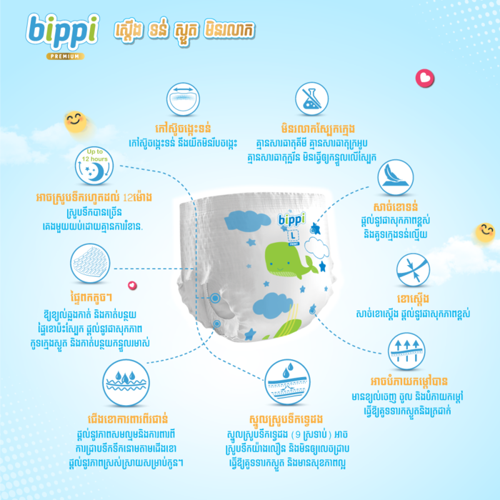 Gentle on Skin: No chemical bleach, No Fragrance, No Chlorine. Minimize skin rash. / មិនរលាកស្បែកក្មេង