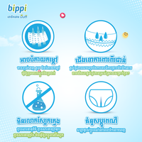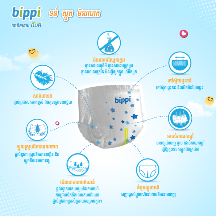 ខោទឹកនោម Bippi Standard កញ្ចប់ធំ (ទំហំ S-80) អាចប្រើបានក្មេងចាប់ពី 4-8 គីឡូក្រាម។ អាចបំភាយចំហាយក្តៅបាន ស្រូបទឹកបានលឿន ហើយច្រើន។ មានជើងខោពីរជាន់ទប់ទឹកនោម ការពារជ្រាបទឹក។ មានគំនូសប្តូរពណ៌ពេលស្រូបទឹក។ ផ្ទៃសំឡីទន់ មិនកកិតស្បែកក្មេង។ គ្មានជាតិគីមីដែលមិនបង្កអោយប៉ះពាល់ ឬរលាកស្បែកក្មេង។