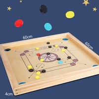 "Flick the striker disk to sink pieces in the corners, a challenging game for 2 or 4. 2-4 Players | 20 Min | age 6+. Carrom is most easily described as ""finger pool"". On a 29"" x 29"" wooden board, players flick a large weighted disc (the striker) at smaller wooden discs (the carrom-men). The goal is to sink your 9 carrom-men (black or white), as well as the red Queen, in the four corner pockets. The first player or team to accomplish this collects points for the round (commonly called a ""board""). A standard game of Carrom continues until one player has 25 points or 8 boards have been completed. Carrom is typically played with powder, and some variations of the game use cues. The most widely played form of 'proper' Carrom is supported by a world wide set of rules known as The Laws of Carrom, and are available from the International Carrom Federation. Carrom bears similarities to Pool and Crokinole, but is a fascinating game in its own right with varied strategies and techniques. No one knows exactly where the game originated. It could have come from Bangladesh, Burma, Egypt, or Ethiopia, but most believe it originated in India."