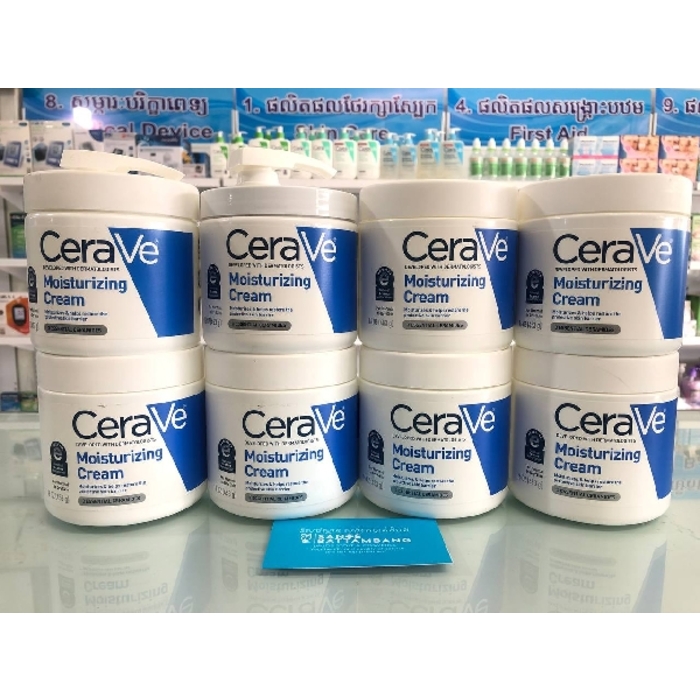 ជាគ្រីមលាបផ្តល់សំណើមខ្លាំងសម្រាប់ស្បែកស្ងួត ជួយពង្រឹងរនាំងការពារស្បែក និងលំនឹងតុល្យភាពសំណើមដោយគ្រឿងផ្សំគោល Ceramide និង Hyaluronic acid. ស័ក្តសមបំផុតសម្រាប់ស្បែកស្ងួតខ្លាំង ស្ងួតរហូតដល់របកស្បែក ប្រេះរមាស់។ ជាមួយនឹងបច្ចេកវិទ្យា MVE ទប់សំណើមបានល្អ និងបញ្ច្រៀបយឺតៗនូវសារធាតុសំណើមចូលទៅក្នុងរនាំងការពារស្បែក។ មិនមានក្លិនដែលបង្កឲ្យរោល ឬងាយប្រតិកម្ម។ Barrier-restoring moisturizing cream. While a compromised skin barrier can lead to dryness and itching, a moisturizing cream with hyaluronic acid and ceramides can help. By hydrating the skin and restoring its natural barrier, a cream with these ingredients can help those with even dry to very dry skin improve the look and feel of their skin. CeraVe Moisturizing Cream includes 3 essential ceramides that work together to lock in skin's moisture and help restore your skin’s protective barrier. MVE technology encapsulates ceramides to ensure efficient delivery within the skin’s barrier and slow release over time. Supporting your protective skin barrier, long after you’ve finish applying. Developed with dermatologists and suitable for dry and very dry skin on the face and body, this rich, non-greasy, fast-absorbing moisturizing cream features our patented MVE Delivery Technology to release a steady stream of moisturizing ingredients throughout the day and night. CeraVe Moisturizing Cream with ceramides is fragrance free.