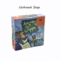 In Kakerlakensuppe players work together to create a soup from leeks, peppers, carrot and mushrooms – but they won't always be saying which ingredient they're adding to the pot! The 128 cards – 112 vegetable cards in the four types and 16 "taboo" vegetable cards, four of each type that bear cockroaches – are shuffled and divided among the players. On a turn, a player plays the top card from his deck onto the central pile of cards, naming the vegetable as he plays it, e.g., "Pepper!" – except in the following situations: • If his vegetable matches the previously played vegetable, the player must lie. • If his vegetable matches the claim made by the previous player (perhaps because that player lied), then the player must lie. • If he plays a taboo card, which shows a cockroach slurping from a spoon, he must slurp and the next player starts a new pile next to the first one so that the taboo card remains visible. • If his vegetable matches a visible taboo card, he must slurp – unless the last person who played such a card slurped, in which case he must say, "Mmmm". Make a mistake or stumble or hesitate too long, and a player must pick up all cards played to that point in the game. The first player to run out of cards wins! Can be combined with Cockroach Salad.