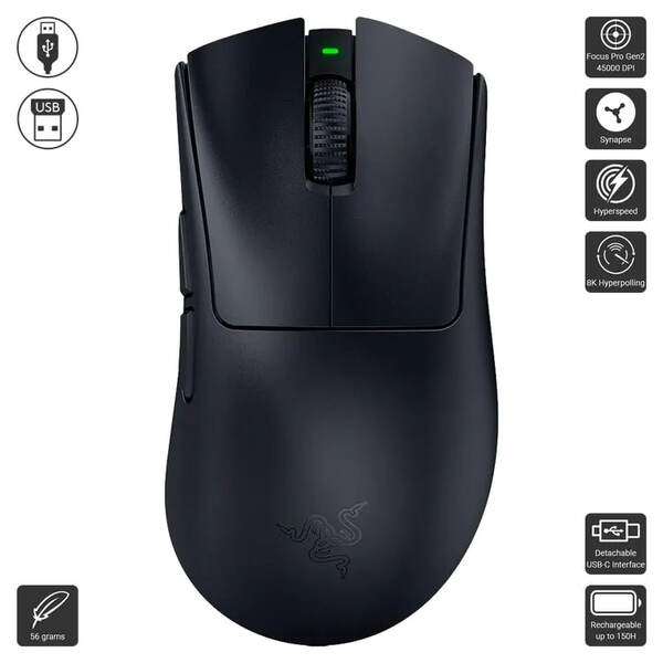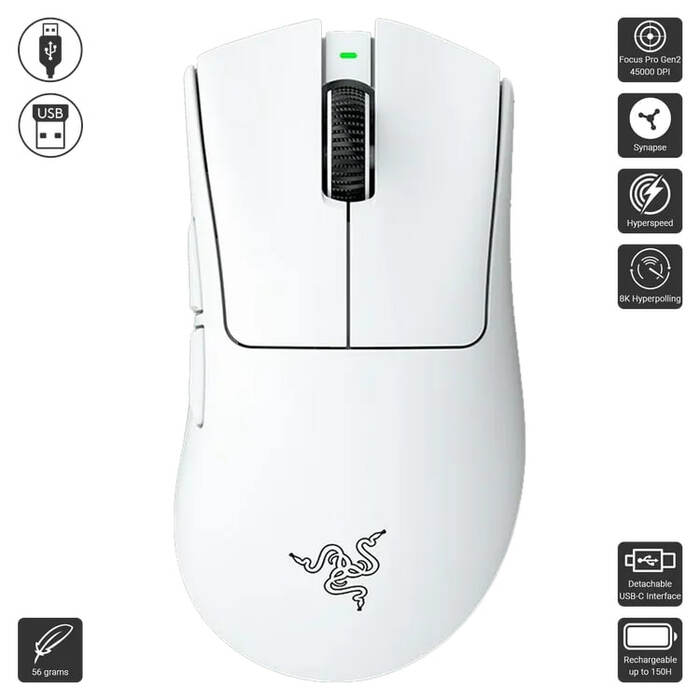 - 56 G* ULTRA-LIGHTWEIGHT DESIGN : Faster Swipes. Effortless Control. Re-engineered with weight optimizations and a smooth-touch finish, our latest DeathAdder gaming mouse is now more than 10% lighter than its predecessor.