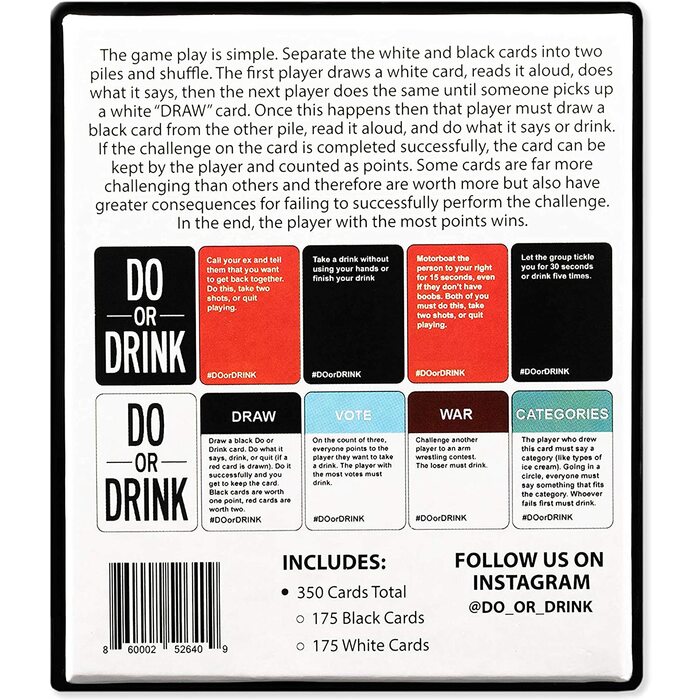 How to Play: The game play is simple. Separate the white and black cards into two piles and shuffle. The first player draws a white card, reads it aloud, does what it say, then the next player does the same until someone picks up a white "DRAW" card. Once this happen, that player must draw a black card from the other pile, read it aloud, and do what it says or drink. If the challenge on the card is completed successfully, the card can be kept by the player and counted as points. Some cards are far more challenging than others and therefore are worth more but also have greater consequences for failing to successfully perform the challenge. In the end, the player with the most points wins.