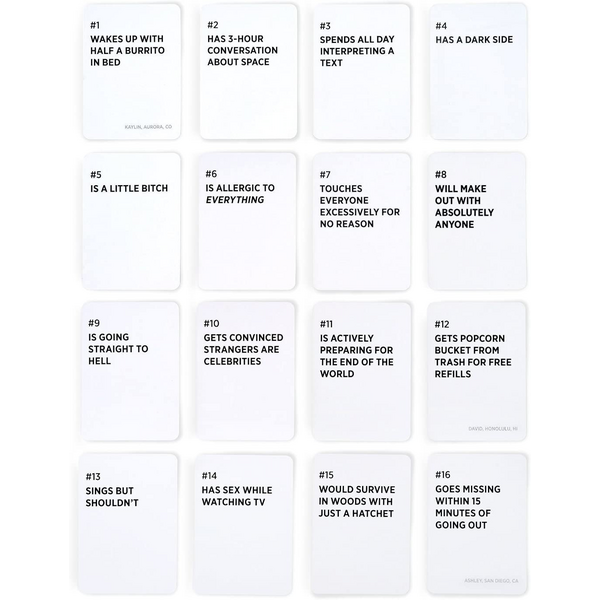 First a player declares themselves the judge and reads a card aloud. Each person then says who in the group should be tagged with this card and why.