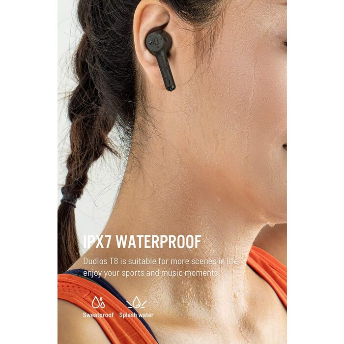 IPX7 Waterproof: Dudios T8 true wireless earbuds boast [IPX7-rated] protection that defends against light rain and sweat in the gym.