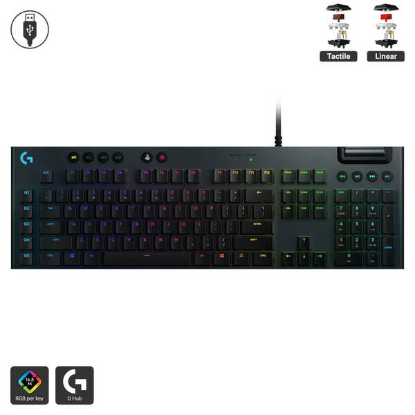 The Logitech G813 LIGHTSYNC RGB Mechanical Gaming Keyboard is an ultra-thin, premium-built keyboard featuring low-profile GL mechanical switches, per-key RGB lighting, five programmable G-keys, dedicated media controls, and USB passthrough—delivering speed, comfort, and style for both gaming and productivity.