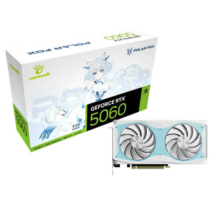 The Manli Polar Fox RTX 5060 OC is an overclocked edition powered by NVIDIA’s Blackwell architecture, featuring 3,840 CUDA cores and 8 GB of ultra-fast GDDR7 memory. With its custom dual-fan Polar Fox cooler and stylish two-tone aesthetics, it delivers impressive 1080p performance and entry-level 1440p capabilities with advanced ray tracing and DLSS 4 support.