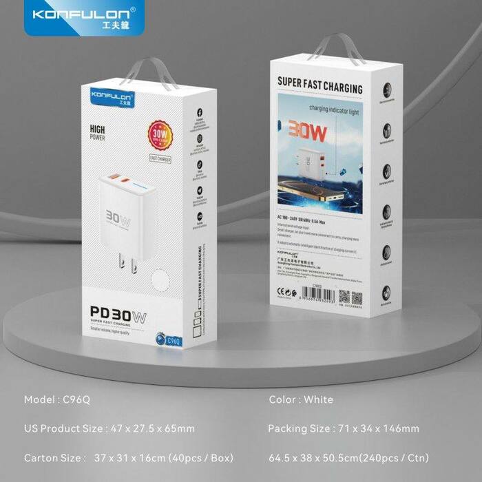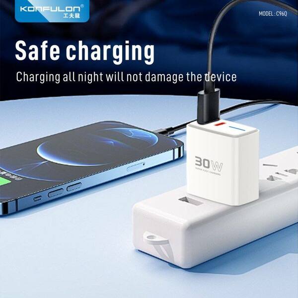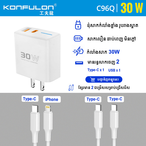 Konfulon ឈុតដុំសាកលឿនពិសេស USB និង TYPE-C 30W ម៉ូដែល C96Q