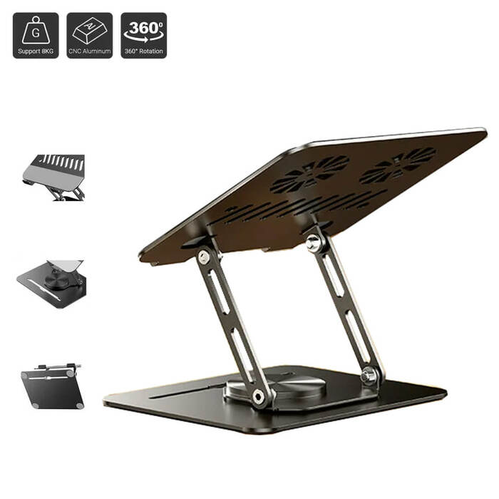 This sleek white laptop stand features a fan-shaped hollow design for improved airflow, a foldable and portable structure, and 360° rotatable base. Made with full carbon steel material, it's built for durability and versatility in any workspace.