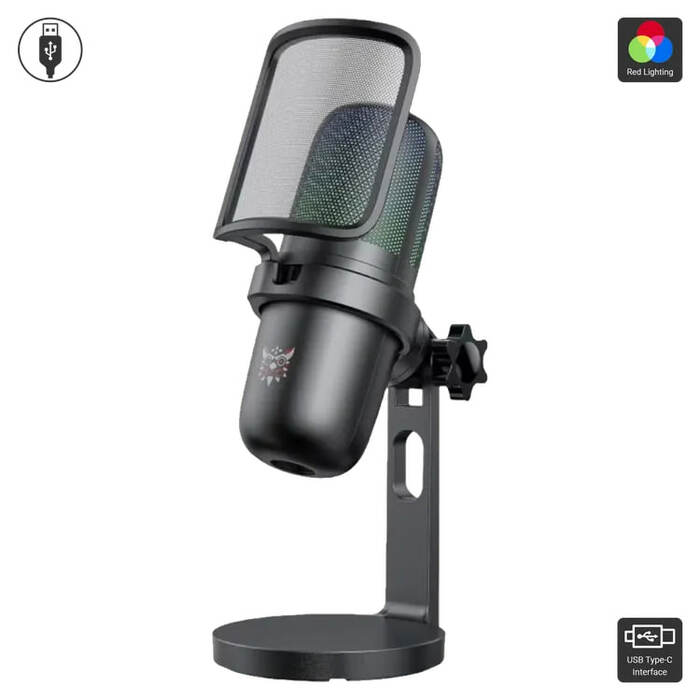 The Onikuma M730 is a compact USB desktop streaming-microphone with RGB lighting. It features plug-and-play functionality, allowing instant use when connected to a PC or other USB-capable device. The microphone has a useful mute-by-touch function and comes with a touch-mute button, a base that allows angle adjustment, and includes a pop filter to help reduce unwanted noise.