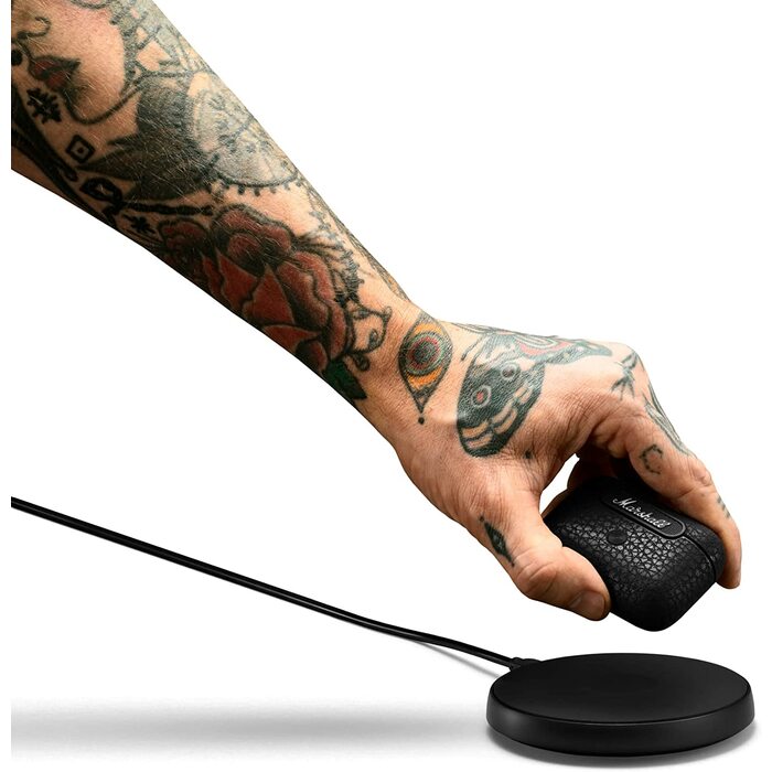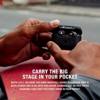 You should never have to go down in sound when you go down in size. Motif A.N.C. delivers the same Marshall sound in a design that is both sturdy and slim. These headphones are the definition of rugged, with IPX5-rated earbuds and an IPX4-rated scratch-proof pocket-sized charging case, so you can carry it around with you and keep the music going.