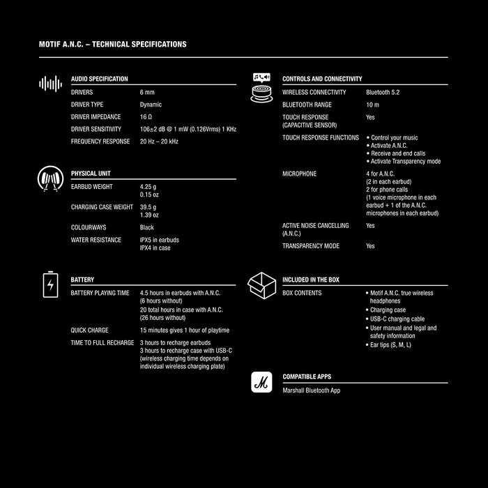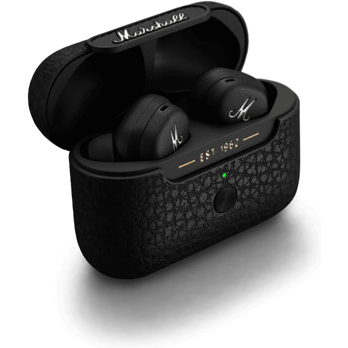 This is Motif A.N.C., the true wireless headphones from Marshall that amplify your audio while shutting down the noise around you with active noise cancellation. Carry the big stage in your pocket with 20 total hours of wireless playtime and the sturdy portable charging case. These wireless earbuds deliver big on their promise of thunderous sound in a neat package. Enjoy amplified audio in a sealed-fit design that is made for all-day listening.