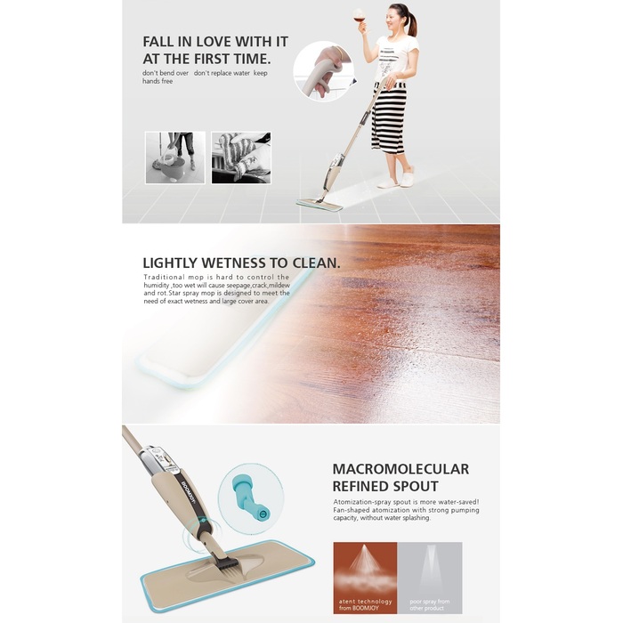 BOOMJOY P4 Elaborated Spray Mop New Version 2020 Lightly Wetness To Clean. Designed with a comfortable ergonomic handle, gently remove dirt and debris from, hardwood, tiles, marble, ceramic and laminate flooring through pressure-controlled spray handles, protects the floor. Boomjoy P4 is capable of producing very fine mist for even spray and faster cleaning. Product from Singapore.