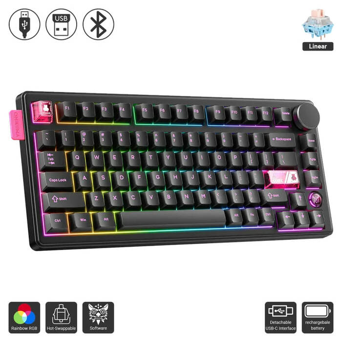 The Onikuma MT706 is an 81-key triple-mode mechanical keyboard with 1 ms response, hot-swappable switches, PBT keycaps, gasket-mount design, RGB lighting, and a detachable wrist rest—built for esports performance and comfort.