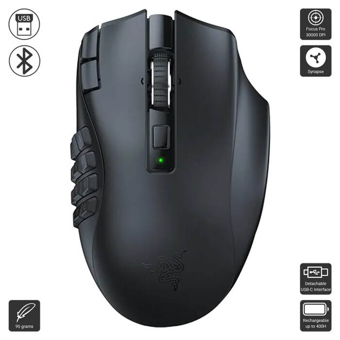 Rise to the top of your guild with the Razer Naga V2 HyperSpeed—a best-in-slot wireless ergonomic MMO mouse. Optimize skill rotations with an arsenal of 19 buttons and a dual mode scroll wheel. Power through raid progression with potent wireless performance backed by up to 250 hours of battery life on HyperSpeed Wireless.