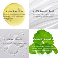 _ 10% Azelaic ដែលជារូបមន្តដ៏មានអានុភាពដែលជួយឱ្យស្បែកភ្លឺថ្លា និងរលោង ខណៈពេលដែលកាត់បន្ថយស្នាមជាំ និងស្នាមអុចខ្មៅ។ សេរ៉ូមនេះគឺល្អឥតខ្ចោះសម្រាប់អ្នកដែលមានស្បែកងាយកើតមុន ឬឡើងពណ៌ ហើយសាកសមសម្រាប់គ្រប់ប្រភេទស្បែក។