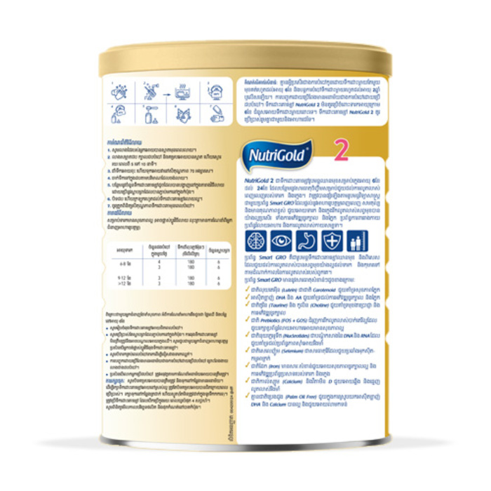 NutriGold II SMART GRO 2xDHA 400g suitable for baby 6-24 months. NutriGold is a premium formula milk which 100% originally produced in Holland by Ausnutria. Ausnutria has more than 75 years of experience and we guarantee the quality and food safety of all our products. រូបមន្តទឹកដោះគោម្សៅ NutriGold II សម្រាប់ក្មេង 6-24ខែ។ NutriGold ផលិតផលរបស់ប្រទេសហូឡង់សុទ្ធ 100% ផលិតដោយក្រុមហ៊ុន Ausnutria ដែលមានបទពិសោធន៍លើសពី 75ឆ្នាំមកហើយ។ យើងមានការធានាគុណភាព និងសុវត្ថិភាពចំណីអាហារលើរាល់ផលិតផលទឹកដោះគោម្សៅរបស់យើង។ មានវត្តមានលើទីផ្សារប្រទេសកម្ពុជាលើសពីរឆ្នាំមកហើយ។