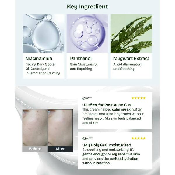 - Mugwort and Centella Asiatica Extract បំបាត់ភាពក្រហម និងរោលរមាស់ ជំរុញឱ្យស្បែកមានតុល្យភាព និងសុខភាពល្អ។