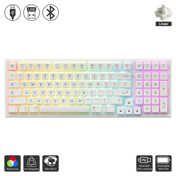 The PC98B Plus Air is a compact "1800‑compact" mechanical keyboard designed for Mac-style layout and productivity. It features an OSA-profile keyset in clean white, tri-mode connectivity, hot-swappable switches, customizable RGB, and a sleek yet robust construction.