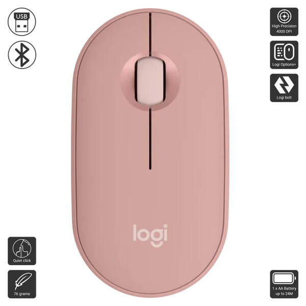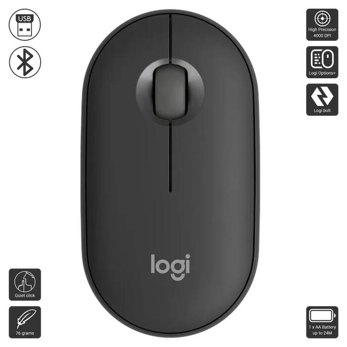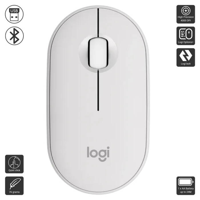 The Logitech Pebble 2 is a sleek, silent wireless mouse offering dual connectivity (Bluetooth or USB), precise tracking, quiet clicks, long battery life, and a minimalist design for portability.