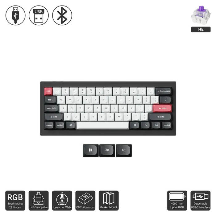 - In addition to the Hall Effect magnetic switches, the Q4 HE introduces a 2.4G connection mode with an impressive 1000Hz polling rate, further ensuring a lightning-fast gaming experience. What's more, it also boasts premium features such as Bluetooth connectivity, a double-gasket design, enhanced acoustic foams, an all-aluminum body, PBT keycaps and more.