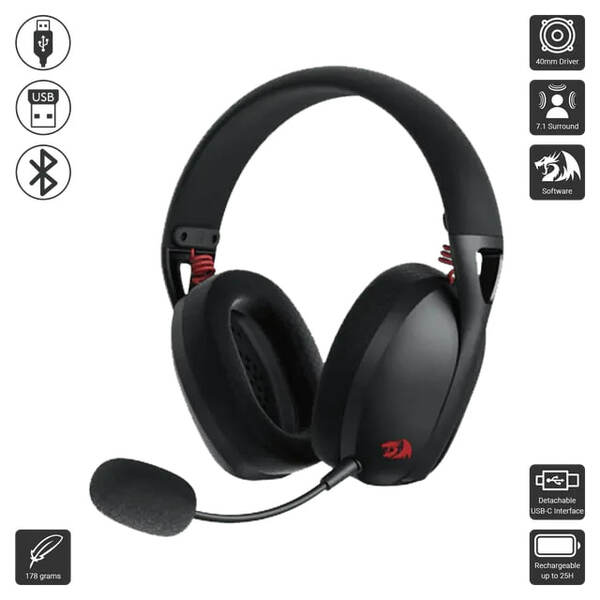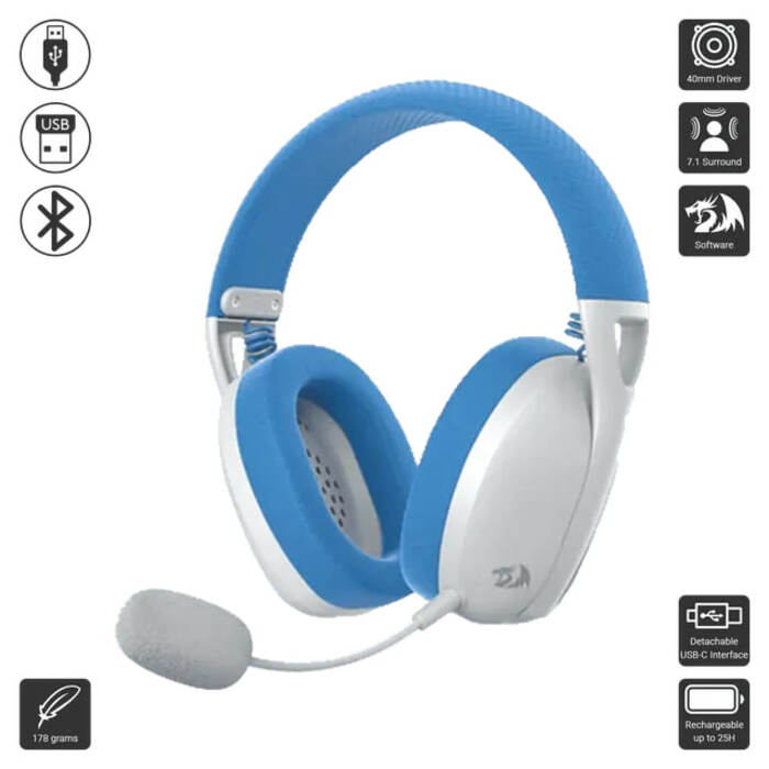 Redragon H848 Bluetooth Wireless Gaming Headset - Lightweight - 7.1 Surround Sound - 40MM Drivers - Detachable Microphone - Multi Platforms for PC, PS5/4/3, Switch, Mobile