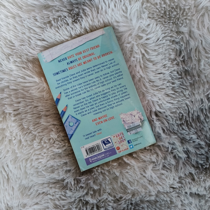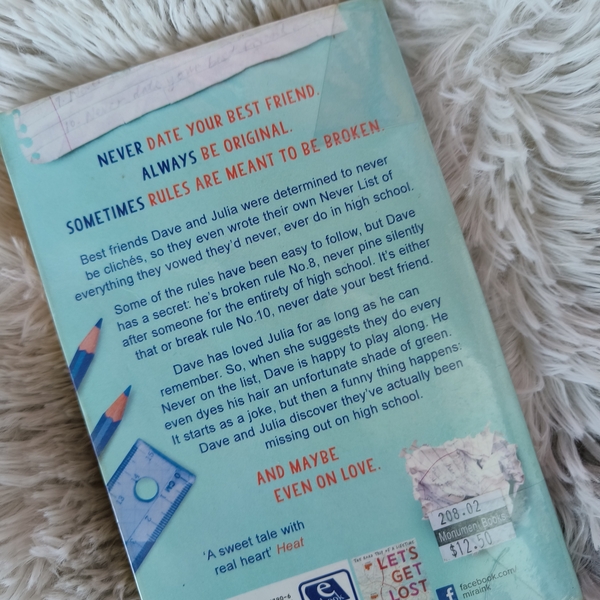 Never date your best friend. Always be original. Sometimes rules are meant to be broken. Best friends Dave and Julia were determined to never be cliché high school kids—the ones who sit at the same lunch table every day, dissecting the drama from homeroom and plotting their campaigns for prom king and queen. They even wrote their own Never List of everything they vowed they’d never, ever do in high school. Some of the rules have been easy to follow, like #5, never dye your hair a color of the rainbow, or #7, never hook up with a teacher. But Dave has a secret: he’s broken rule #8, never pine silently after someone for the entirety of high school. It’s either that or break rule #10, never date your best friend. Dave has loved Julia for as long as he can remember. Julia is beautiful, wild and impetuous. So when she suggests they do every Never on the list, Dave is happy to play along. He even dyes his hair an unfortunate shade of green. It starts as a joke, but then a funny thing happens: Dave and Julia discover that by skipping the clichés, they’ve actually been missing out on high school. And maybe even on love.