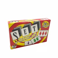 In SET, each card contains 1-3 objects, with all of the objects on a card having the same color, shape and shading, e.g., two purple shaded ovals. Colors, shapes, and shadings come in three different types: green, purple and red; oval, diamond and squiggle; and solid, shaded and outlined. All players compete simultaneously and try to claim sets of cards in a single pass through the deck. A set consists of three cards that are either all alike or all different in each attribute. For example, if all three cards have the same number of objects, but three different shapes, shadings, and colors, then those cards are a set; if two of the cards have a common attribute that is not shared by the third, they are not a set. To play, one person takes the deck and lays out twelve cards face up. The first person to spot a set collects those three cards; if the player was mistaken, then this player cannot claim a set until after another player has done so. After someone has claimed a set, the cardholder lays out three more cards. (If all players agree that no sets can be claimed, then the cardholder lays out three more cards. These cards aren't replaced after someone claims a set.) Whoever claims the most sets wins!