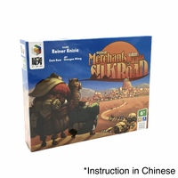 "2-5 Players | 20min | Age 6+. In Merchants of Silk Road (絲路商人), players lay out all of the tiles in a single, snaking line, with the tiles being 1-6 squares large (in various sizes from 1x1 to 2x3). Each player has an individual game board with 24 empty squares on it in a 4x6 grid. On a turn, the player whose camel is at the back of the line rolls a die. This player either accepts this result, moves their camel forward this many spaces on the path, and takes the tile their camel would land on and places it in their grid OR passes; if the player passes, then the player whose camel is next to last can take this die roll instead, with the original player rolling the die again. Whoever first fills their grid wins!"