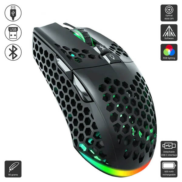SM600 Wireless Gaming Mouse with Tri-Modes(BT5.1+BT5.1+2.4G),Rechargeable RGB Wireless Mouse with Honeycomb Shell,Side Buttons Computer Gaming Mice
