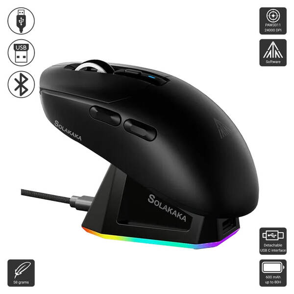 The SM820 is a lightweight tri-mode wireless gaming mouse featuring 2.4GHz, Bluetooth 5.0, and Type-C wired connectivity. Equipped with a high-precision PAW3311 sensor (up to 24000 DPI), an RGB magnetic charging dock, and programmable buttons, it delivers fast, accurate performance and a comfortable ergonomic design ideal for both gaming and work.
