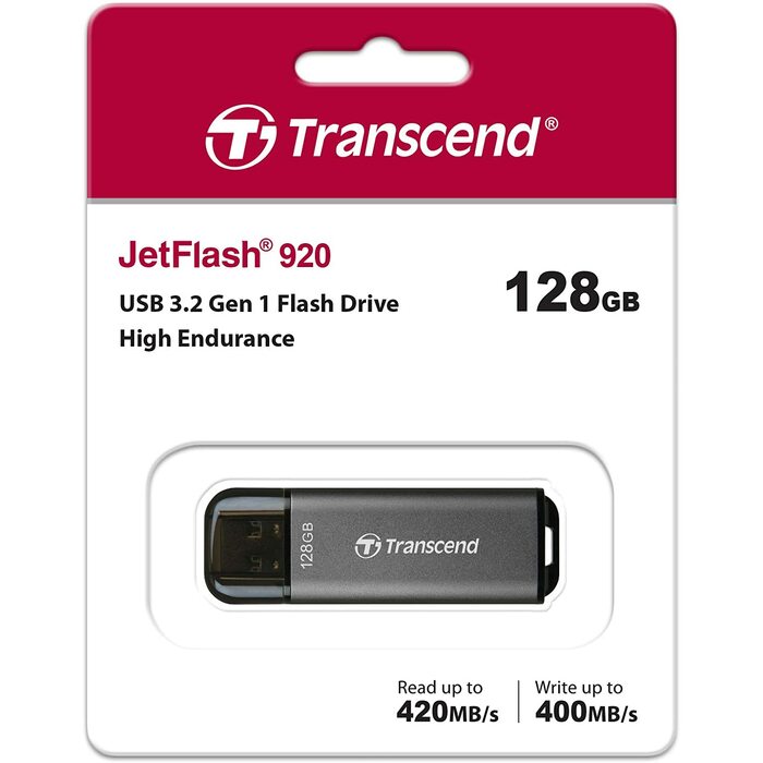 Introducing Transcend's high endurance, high performance JetFlash 920, a USB flash drive that is anything but ordinary. Boasting sensational read speeds of up to 420MB/s and write speeds of up to 400MB/s, the JetFlash 920 delivers top-notch performance in a sleek and portable design. Its aluminum metallic housing will safeguard your data wherever you go.
