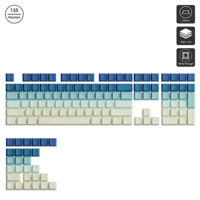 A chic, cherry‑profile keycap set featuring a smooth gradient that shifts from rich teal to crisp ivory. Crafted from durable PBT & polycarbonate via double‑shot molding, these shine‑through side‑printed caps let your RGB backlight glow vibrantly.