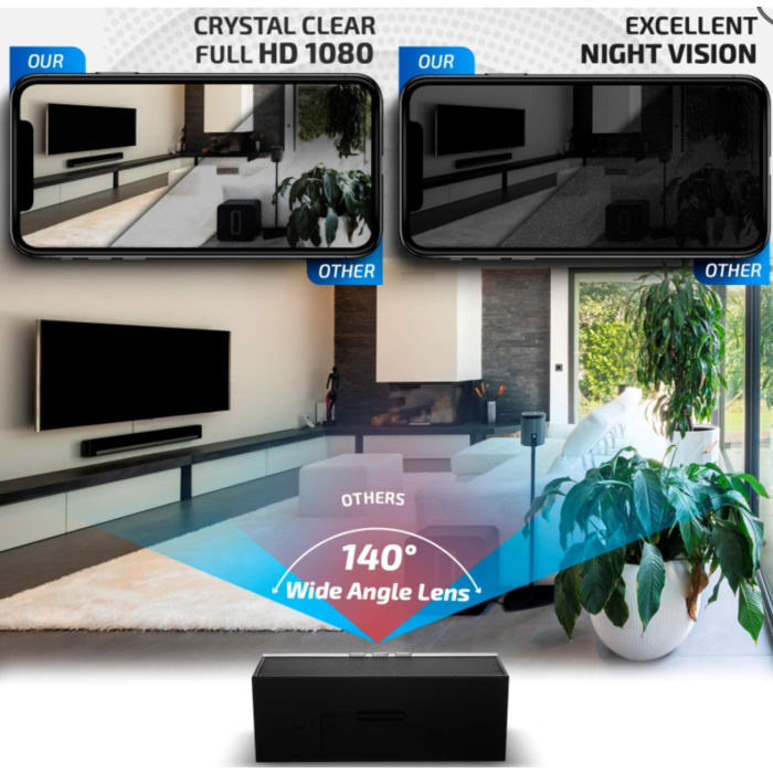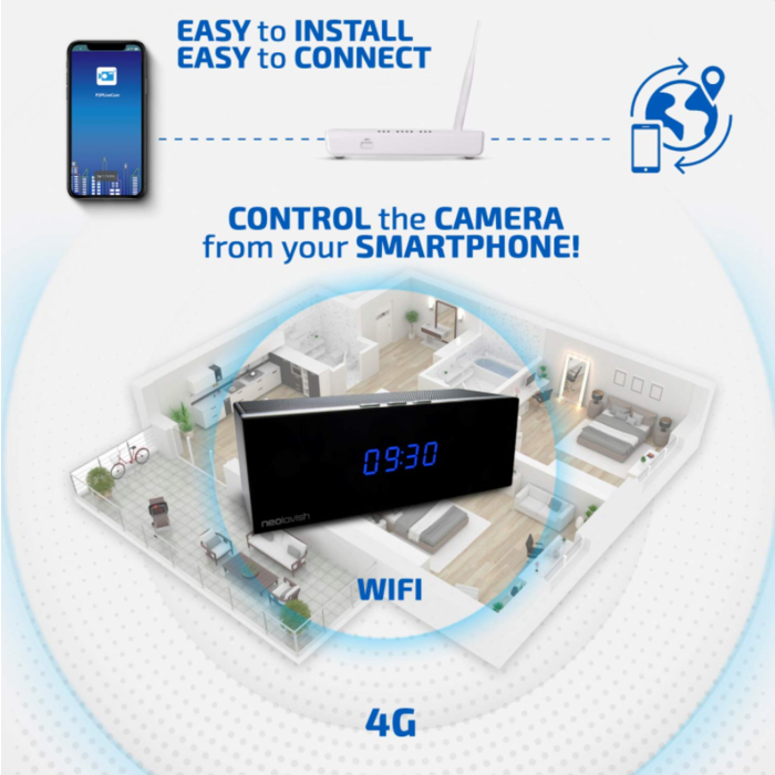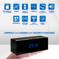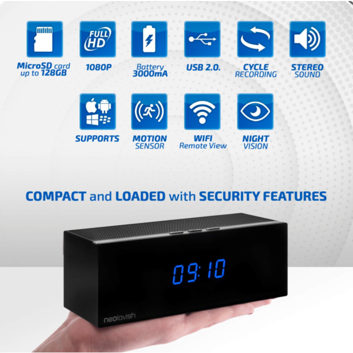 8 reasons this Hidden Camera Clock with Speakers is the perfect Home Security Camera: Use as Nanny Cam or Pet Camera Cycle and Loop Recording Easy to install and Set-up Undetectable Hidden Camera High-Definition 1080P Video Quality Saves video directly to 128GB MicroSD card Remote Monitoring via iOS and Android app Portable and Wireless- no need to mount on walls our use internet LAN cable Other features of our Spy Camera Clock you will Love: Built-in Stereo Speakers Digital LED Clock Display 140-degree viewing angle Real-time push notification Adjustable brightness and contrast Configurable Motion Detection Levels Eight IR lights for clear Night Video Recording 3000mAh removable and rechargeable battery Powers either via battery or direct power supply