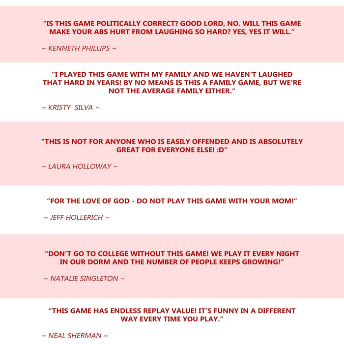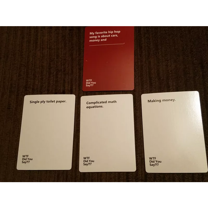 Each player starts with 10 white cards in their hand. Whomever masturbated most recently is named the first ROC or Reader of Cards. After a thorough hand washing, this person draws and reads a red card out loud. Each player (not the reader) then passes their “funniest” white card face down to the ROC. Once all white cards are received the ROC reads each white card out loud in context of the red card.