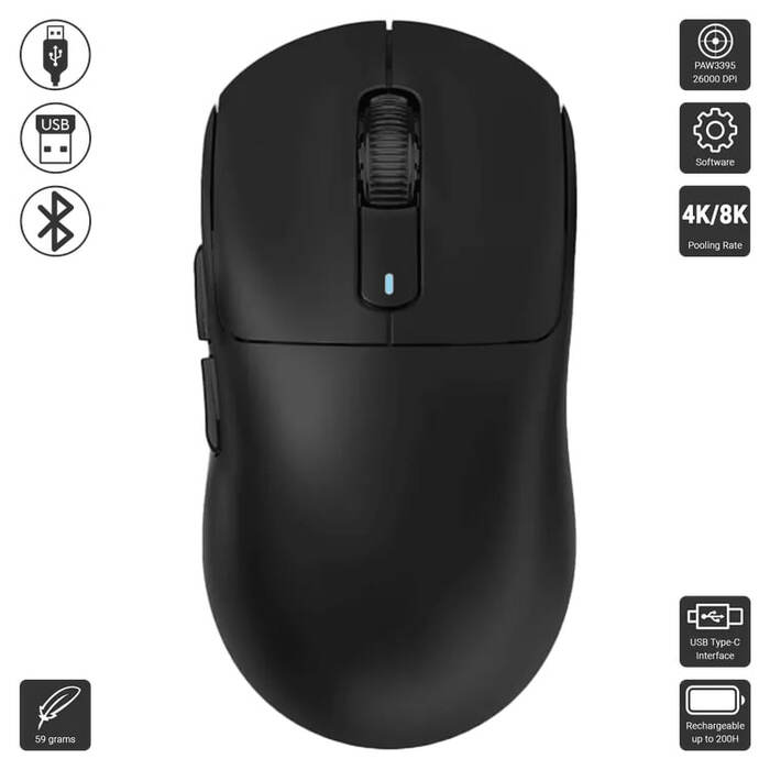 4K/8K Hz, 59g SUPERLIGHT, PixArt, PAW3395 Gaming Sensor, BT/2.4G Wireless/Wired, 6 Adjustable DPI up to 26000, 200 hrs Battery