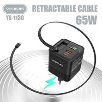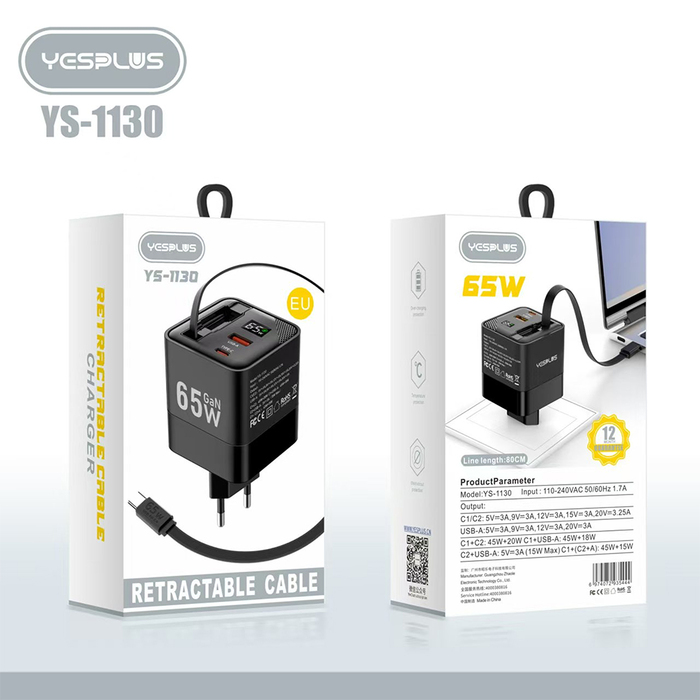 YESPLUS_YS-1130# 65W GaN CHARGER + RETRACTABLE CABLE/Black/1pcs