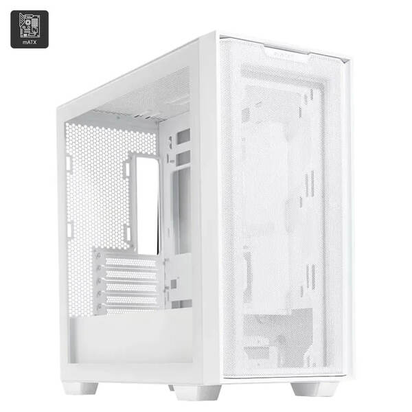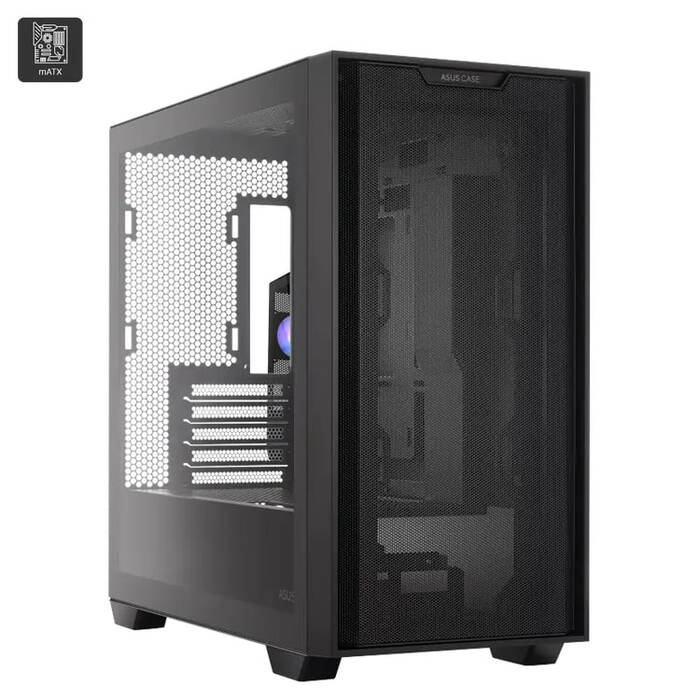 The ASUS A21 is a sleek, high-compatibility micro-ATX tower featuring a 40% porous mesh front panel, tempered-glass side, and clean internal layout. It supports robust cooling and full-sized components in a compact, visually striking form factor.