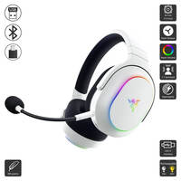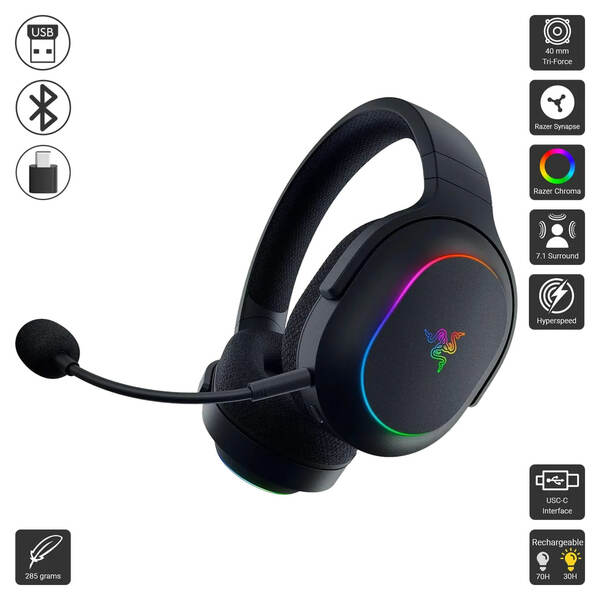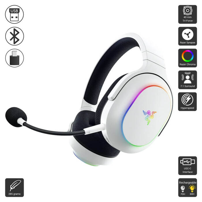 The Razer Barracuda X Chroma is a lightweight, versatile wireless gaming headset featuring Razer TriForce 40mm drivers for immersive sound and a detachable HyperClear cardioid mic for crisp communication. With cross-platform compatibility, 20-hour battery life, and sleek RGB Chroma lighting, it combines comfort, style, and performance for gamers on the go.