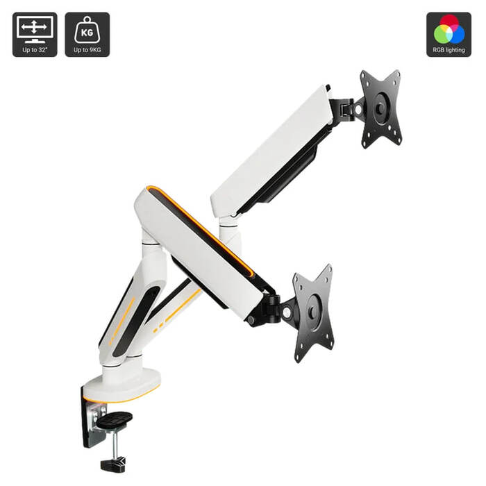 A spring-assisted single monitor arm with RGB lighting, designed for 17″–32″ screens and up to ~9 kg. Offers full adjustability (tilt, swivel, rotation), with clamp or grommet mount for easy desk installation and clean cable management.
