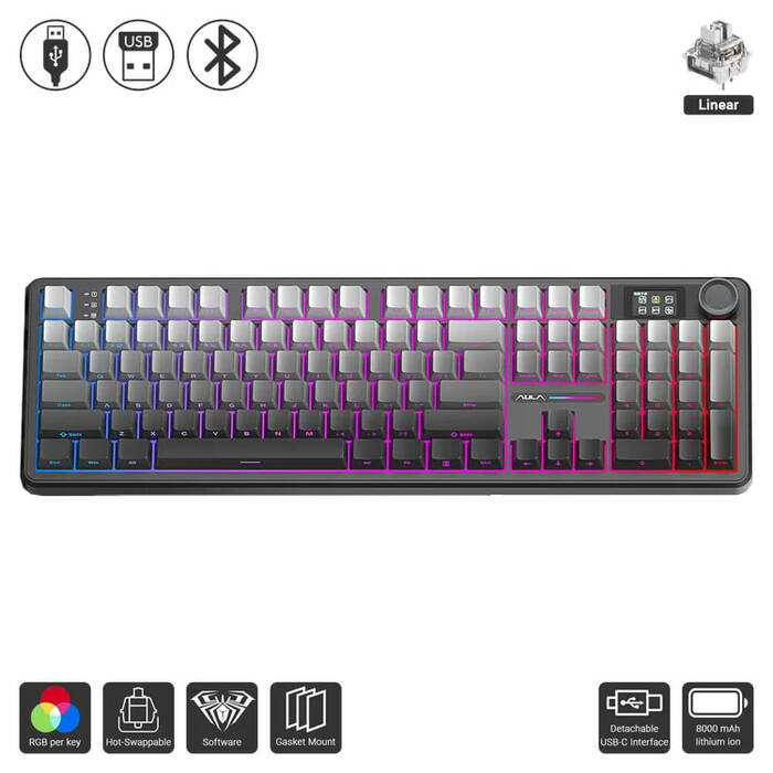 The AULA F108 Pro Tri-mode Mechanical Keyboard features a classic gasket structure design that provides a comfortable and ergonomic typing experience. Its 1.14-inch smart display screen and multi-function knob allow for easy customization and control. Enjoy stable wireless transmission and convenient access to side function keys.