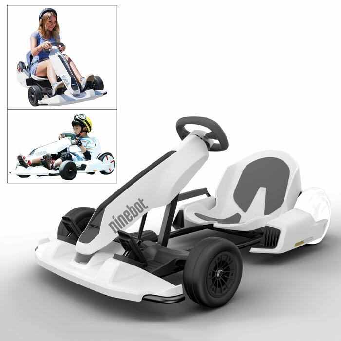 The Gokart Kit coupled with the mobile app allows the rider to select from three different driving levels: Novice, Normal and Sports. Each level or mode relates to distinct driving speed-settings. The Ninebot Gokart features a top speed of 15 MPH, and typical range of 9 miles*. The max recommended payload for the  Ninebot Gokart is 220 lbs. The Ninebot Gokart frame is adjustable to lengths from 51 inches (4.25 feet) to 75 inches (6.25 feet), accommodating the needs of the majority of riders.