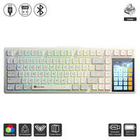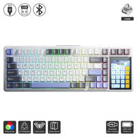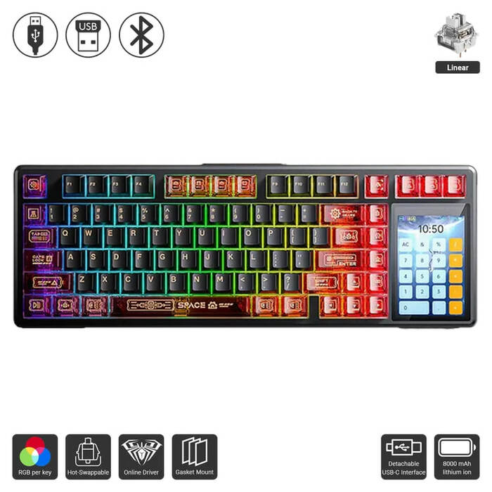 The AULA L99 is a 75% mechanical keyboard featuring a 3.98″ IPS touchscreen, tri-mode connectivity (USB-C, 2.4 GHz, Bluetooth), hot-swappable switches, RGB lighting, and an 8000 mAh battery in a compact gasket-mounted design.