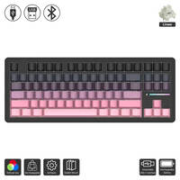 The Attack Shark M87 Pro V2 is a full-size (87-key) gasket-mounted mechanical gaming keyboard featuring tri-mode connectivity (USB-C wired, 2.4 GHz wireless, and Bluetooth), hot-swappable switches, vibrant RGB backlighting, a large built-in battery, and premium PBT keycaps—designed for gamers, typists, and productivity users alike