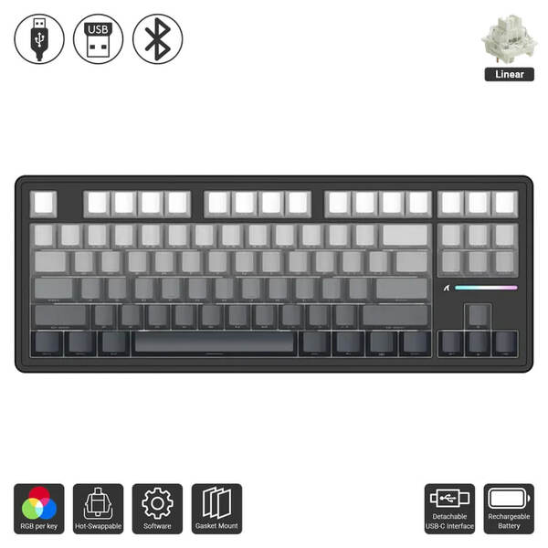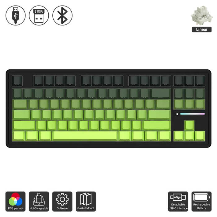 - Side‑Printed Gradient PBT Keycaps: Durable, stylish keycaps with shine-through RGB and a gradient color scheme for a premium aesthetic.