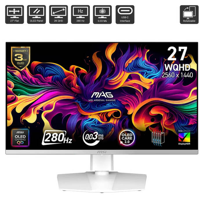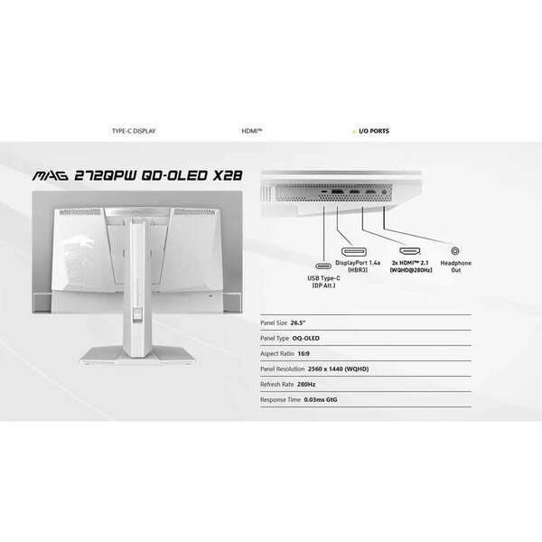 Visualize your victory with the MAG 272QPW QD-OLED X28 gaming monitor. It boasts a 2560x1440 (WQHD) QD-OLED panel, 280Hz refresh rate, and rapid 0.03ms (GtG) response time. VESA certification for ClearMR 15000 and DisplayHDR True Black 400 ensures exceptionally vivid images and mitigates motion blur. OLED Care 2.0 reduces OLED burn-in risks. For console gamers, the MAG 272QPW QD-OLED X28 provide HDMI™ 2.1 ports with 48Gbps bandwidth, 120Hz support, VRR, and ALLM.
