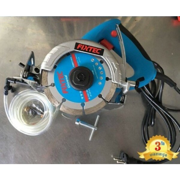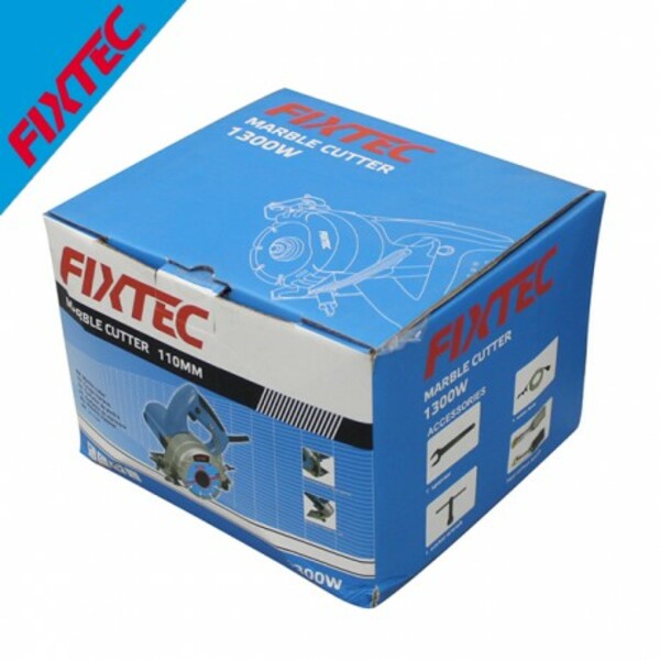 FIXTEC 1300W Marble Cutter | The FIXTEC FMC13002 110mm Wet/Dry marble cutter has a power 1300W motor that delivers the cutting power to cut through granite, porcelain, concrete and other stone materials. The premium 110mm diamond blade allows the user to cut ceramics and stone materials up to 3-centimeters deep-wet or dry. It has a water line that feeds water to the blade, decreasing dust and increasing blade performance and life. The blade bevels to 45 Degrees for quick angled cuts. It also features a Lock-on button reduces fatigue during production cuts. Depth of cut is adjustable and allows user to cut at various depths. FIXTEC Electric Hand Tool 1300W 110mm Marble Cutter Used FIXTEC Electric Hand Tool 1300W 110mm Marble Cutter Used