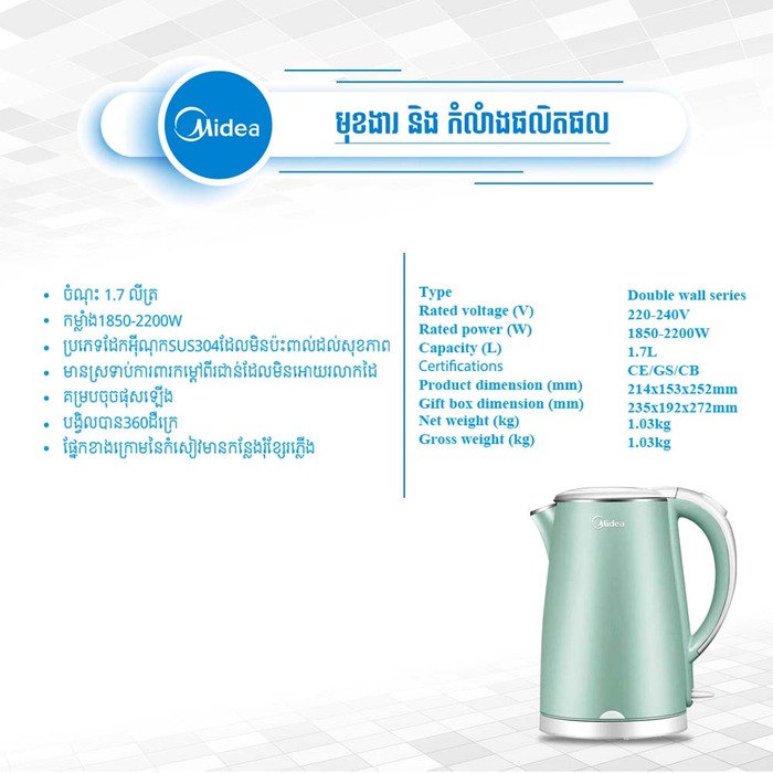 VMALL កំសៀវទឹក Midea 1.7L MK-HJ1705G